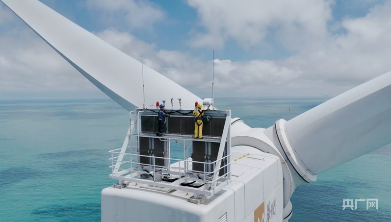 工作人員在風(fēng)機(jī)頂部開展檢修工作(央廣網(wǎng)發(fā) 受訪者供圖)