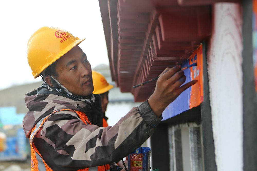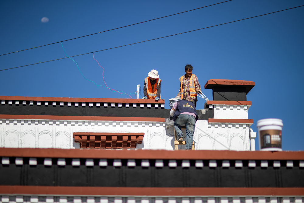 2025年8月11日,定日縣曲洛鄉(xiāng)措昂村彩繪工匠扎西、旦增貢加、拉巴在工作現(xiàn)場。他們都是本村受災(zāi)群眾,通過參與新房建設(shè)獲得勞動(dòng)報(bào)酬。