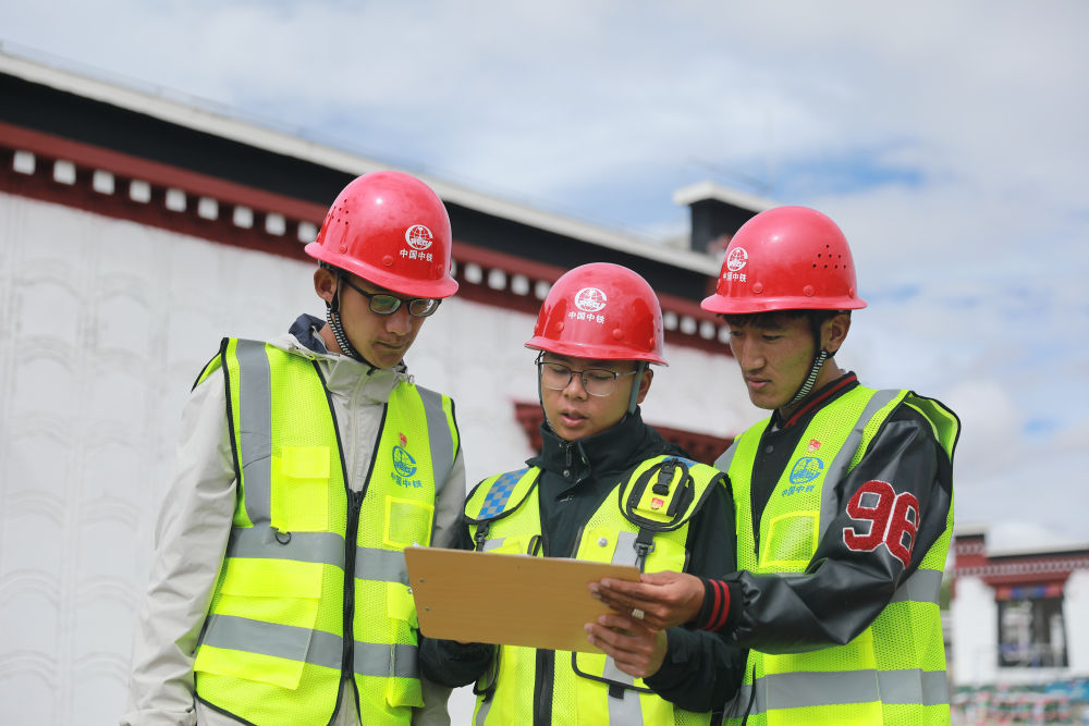 2025年8月10日,技術(shù)人員在中國中鐵定日縣曲洛鄉(xiāng)措昂村民房恢復(fù)重建項(xiàng)目施工現(xiàn)場商討方案。