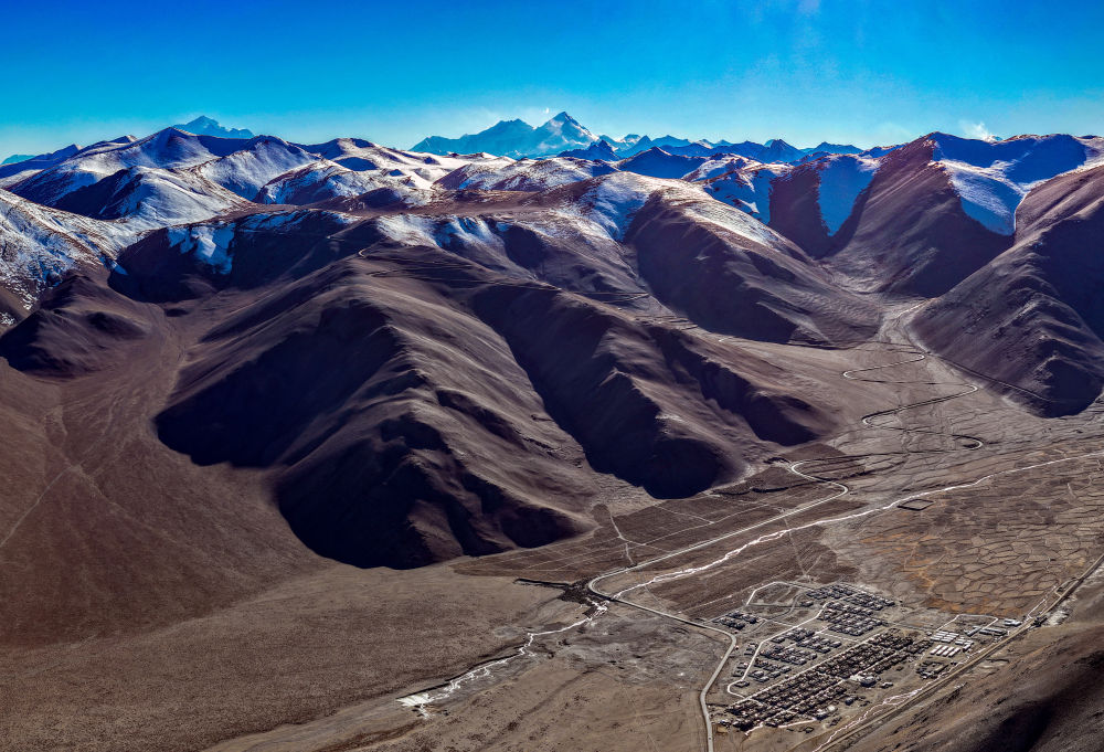 2025年11月12日拍攝的位于珠穆朗瑪峰腳下的定日縣措果鄉(xiāng)野江村(無人機(jī)照片)。靠近珠峰方向的房屋為建成并交付群眾使用的新房。