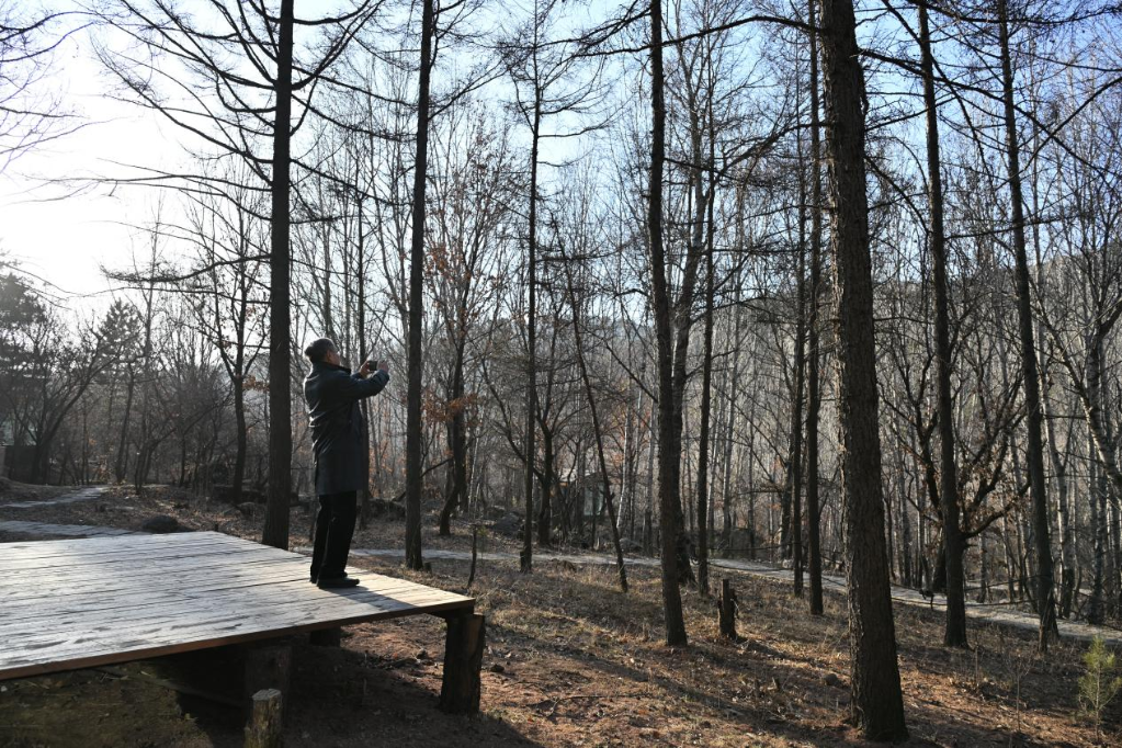 在離石大東溝森林旅游度假區(qū),張紅宇用手機(jī)記錄美景。新華網(wǎng) 發(fā)