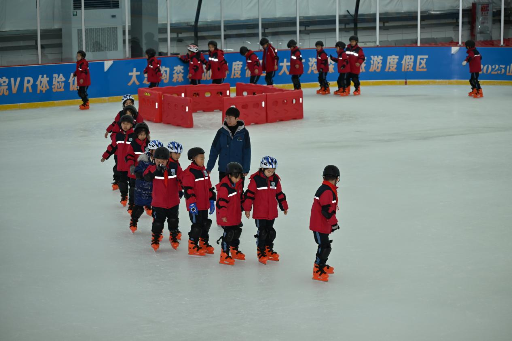 在王營(yíng)莊文旅科創(chuàng)小鎮(zhèn)氣膜滑冰館,離石區(qū)一所小學(xué)的孩子們?cè)隗w驗(yàn)滑冰。新華網(wǎng) 發(fā)