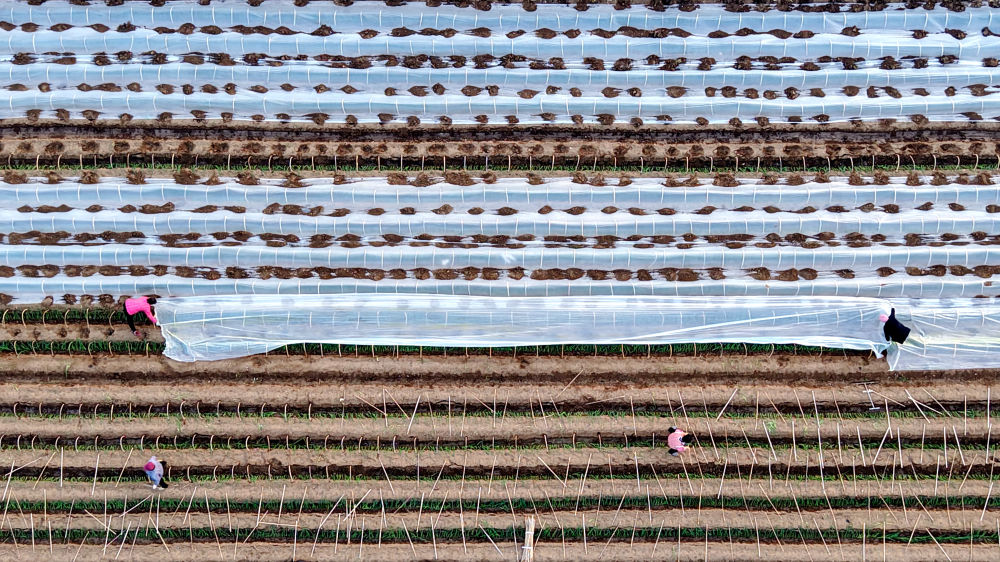 12月11日,在山東省臨沂市平邑縣地方鎮(zhèn),村民為種植的蔬菜幼苗覆蓋保溫薄膜(無(wú)人機(jī)照片)。 新華社發(fā)(武紀(jì)全攝)