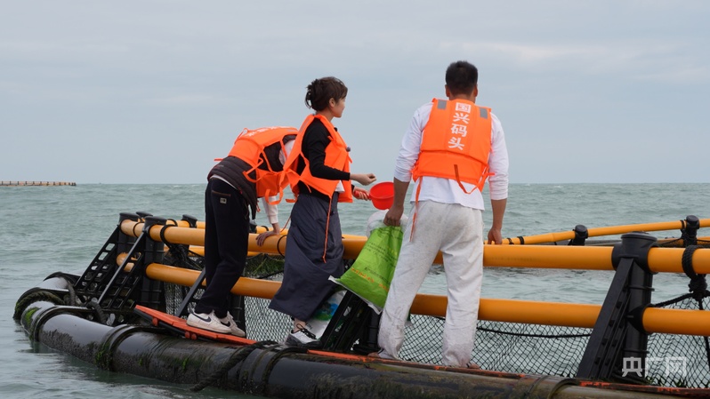 記者(中)在海洋牧場體驗飼料投喂(央廣網(wǎng)記者 張順鵬 攝)