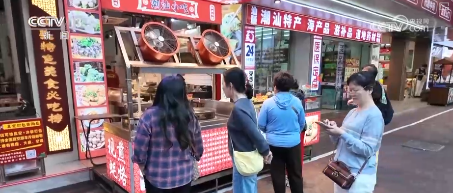 第一站來到汕頭著名的美食集聚地龍眼南路美食街,這里全長470米,涵蓋潮汕特色美食、茶飲甜品、創(chuàng)意餐飲等。游客不僅可以吃上腸粉、粿條湯等傳統(tǒng)早餐,還能品嘗鹵鵝、生腌等招牌菜肴,以及反沙芋頭、腐乳雞翅等特色小吃。這條24小時不打烊的美食街吸引了來自全國各地的游客。