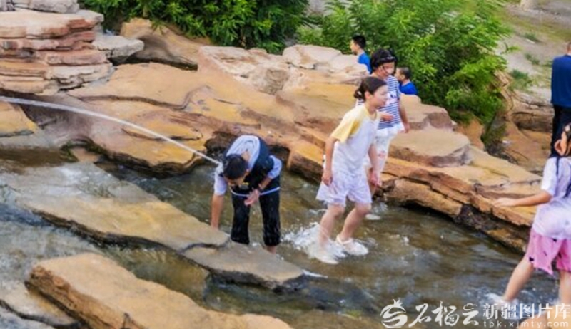 克拉瑪依市金龍湖景區(qū),游客在溪邊嬉水玩耍(2025年7月10日攝)。田國建攝