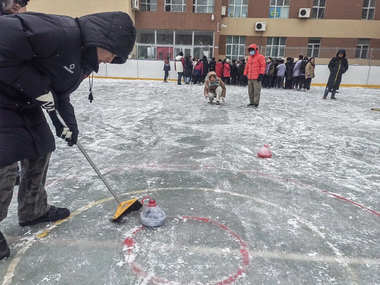 克拉瑪依市第五小學(xué)師生自制“冰壺”,在校園進(jìn)行比賽??死斠朗械谖逍W(xué) 供圖
