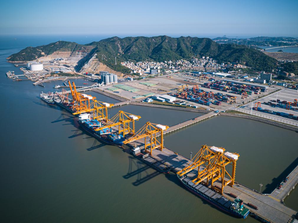 貨輪??吭跍刂莞蹱钤b箱碼頭卸載集裝箱(無(wú)人機(jī)照片)。新華社記者江漢 攝