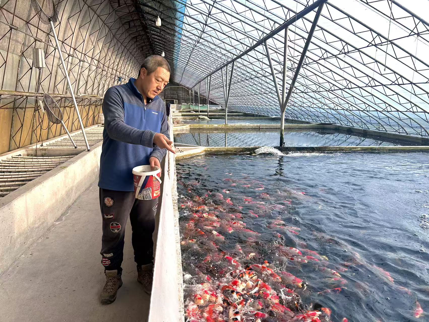 魯家村觀賞魚養(yǎng)殖戶楊義正在給魚喂食。農(nóng)民日報全媒體記者 劉云 攝