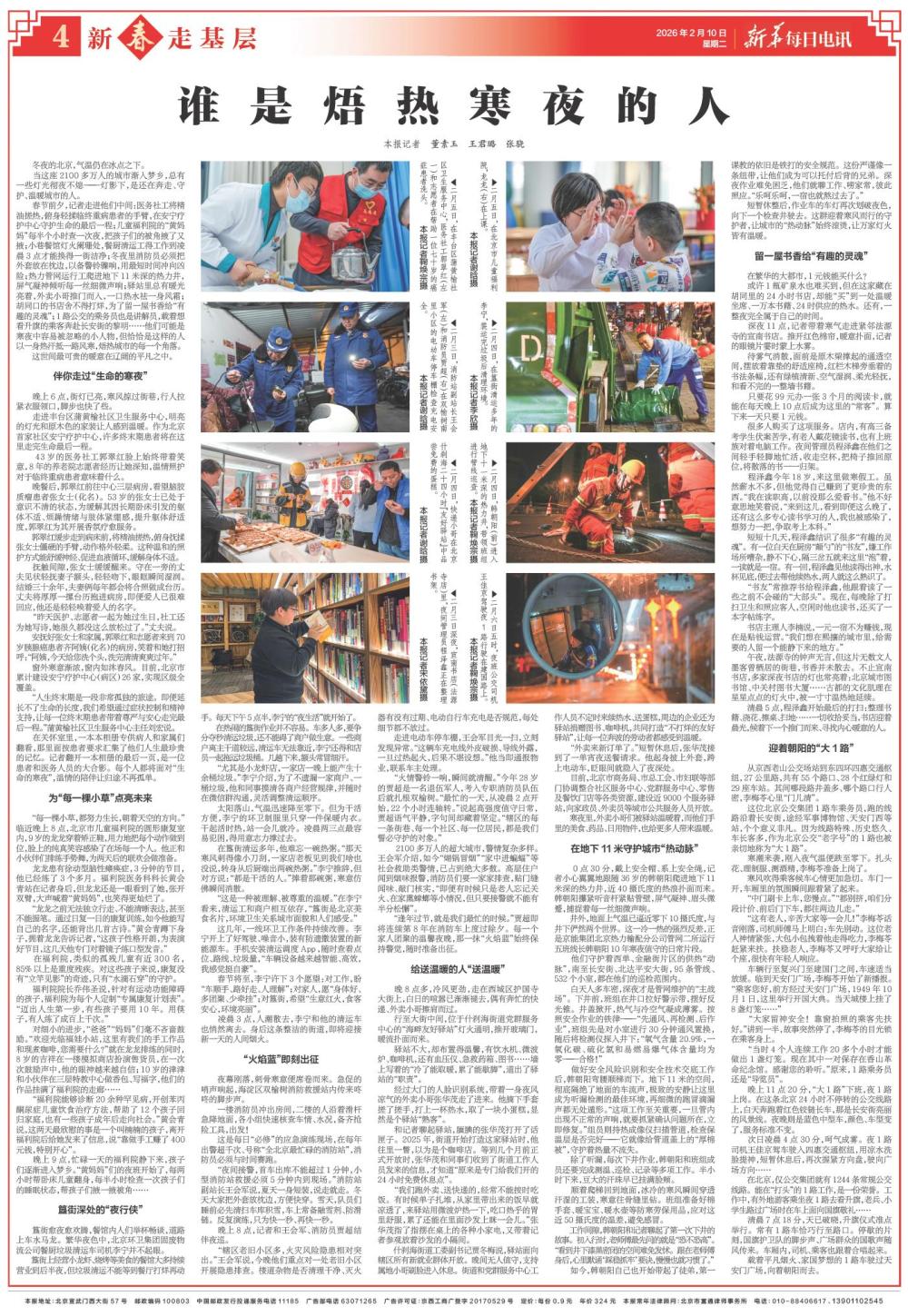 春節(jié)前夕,記者走進(jìn)他們中間:醫(yī)務(wù)社工將精油搓熱,俯身輕揉臨終重病患者的手臂,在安寧療護(hù)中心守護(hù)生命的最后一程;兒童福利院的“黃媽媽”每半個(gè)小時(shí)查一次夜,把孩子們的被角掖了又掖;小巷餐館燈火闌珊處,餐廚清運(yùn)工得工作到凌晨3點(diǎn)才能換得一街潔凈;冬夜里消防員必須把外套放在枕邊,以備警鈴驟響,用最短時(shí)間沖向兇險(xiǎn);熱力管網(wǎng)運(yùn)行工爬進(jìn)地下11米深的熱力井,屏氣凝神傾聽每一絲細(xì)微聲響;驛站里總有暖光亮著,外賣小哥推門而入,一口熱水祛一身風(fēng)霜;胡同口的書店舍不得打烊,為了留一屋書香給“有趣的靈魂”;1路公交的乘務(wù)員也是講解員,載著想看升旗的乘客奔赴長安街的黎明……他們可能是寒夜中容易被忽略的小人物,但恰恰是這樣的人以一身熱汗抵一路風(fēng)寒,焐熱城市的每一個(gè)角落。