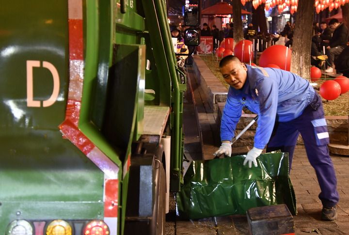 2月4日,在簋街清運(yùn)多年的李寧,裝運(yùn)完垃圾后清理環(huán)境。新華每日電訊記者李欣 攝