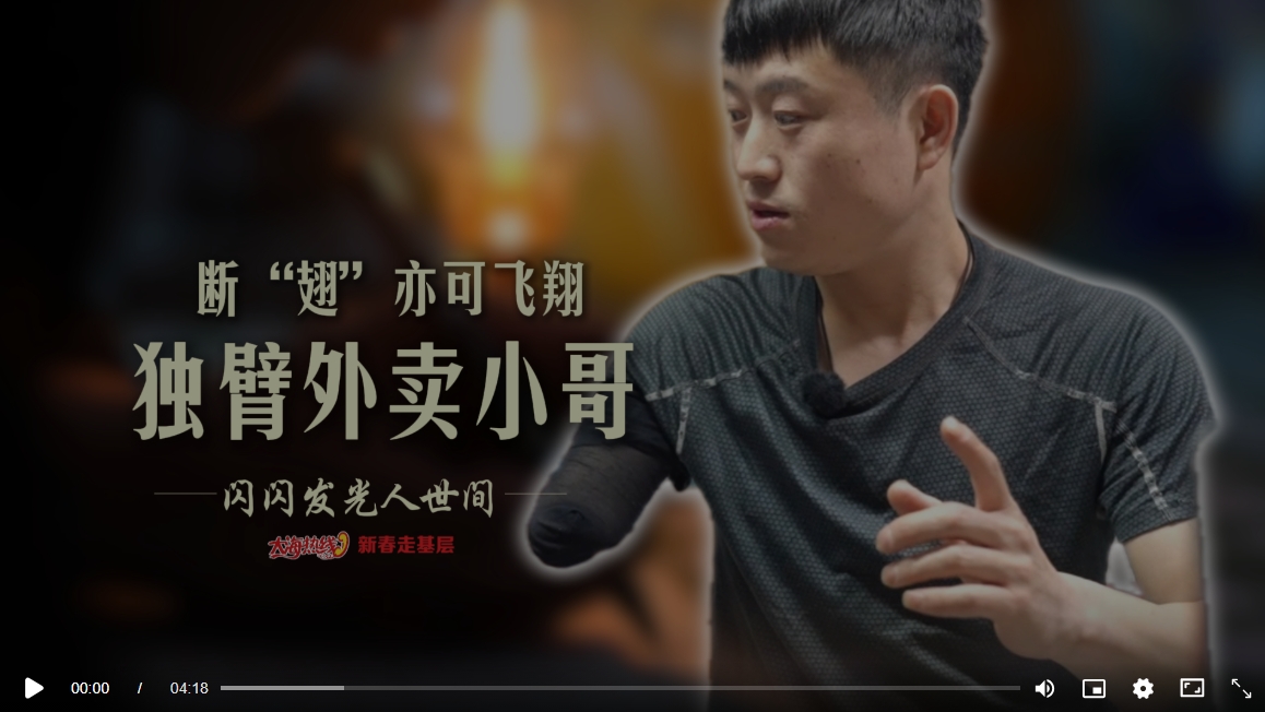 18歲意外失去右臂,不向命運低頭,單手騎車、送餐、爬樓,憑著樂觀和韌勁,風雨無阻跑遍阜新街巷。每天工作12小時、日均配送60單、爬樓100多層、騎行100多公里……