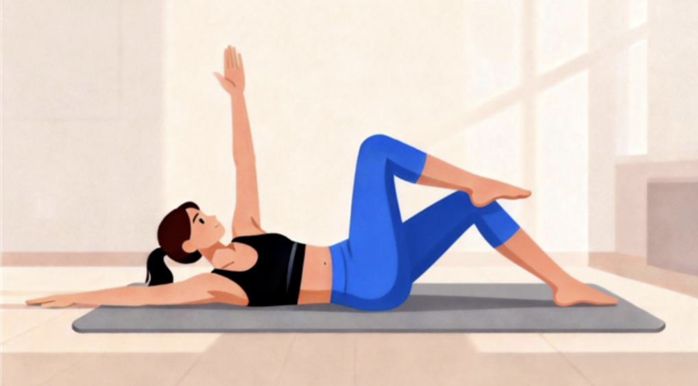 2.側向伸展:站立位,雙腳與肩同寬,雙手交叉舉過頭頂;向左側緩慢彎腰,直到右側腰部有拉伸感(不要扭轉身體),保持15-20秒,回到中立位后換側重復,每側2-3組。