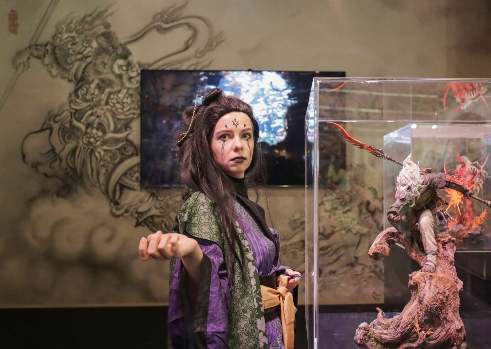 2025年8月20日,在德國(guó)科隆,一名《黑神話(huà):悟空》游戲角色扮演者在游戲科學(xué)展臺(tái)與模型合影。