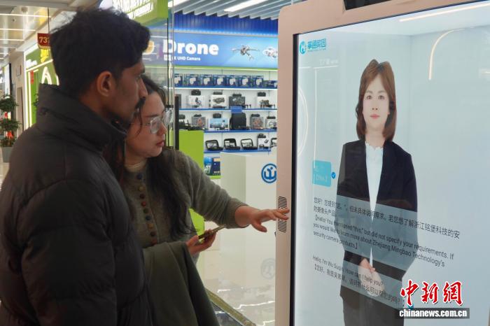 2月28日,浙江義烏,中外客商在店鋪門前與多語種數(shù)字人對話。董易鑫 攝