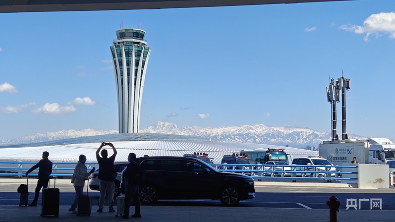 旅客在烏魯木齊天山國際機(jī)場(chǎng)航站樓前拍照留念 (央廣網(wǎng)記者 郭璁悅 攝)