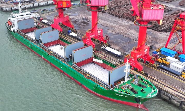 2026年3月18日,在江蘇張家港錦隆重件碼頭,國(guó)際航行船舶在泊位上有序卸運(yùn)進(jìn)口化肥(無人機(jī)照片)。新華社發(fā)(趙國(guó)政攝)
