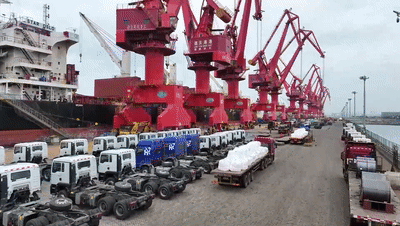在江蘇連云港港贛榆港區(qū)散貨碼頭,一輛輛國產(chǎn)車輛和各類工程機(jī)械設(shè)備正有序裝船,整裝待發(fā)。今年以來,港區(qū)銷往南亞、中亞、波斯灣、西非等地區(qū)的出口訂單穩(wěn)步增長,國產(chǎn)客車、礦卡、自卸車、挖掘機(jī)、裝載機(jī)等工程機(jī)械成為出口主力。