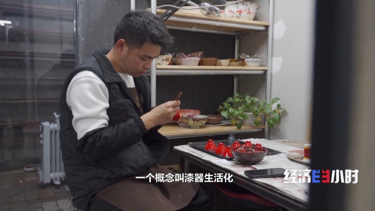 這個開設(shè)在茶館里的漆器文創(chuàng)店,獨特之處在于采購體驗于一體。漆器不再被鎖進玻璃柜,而是被放置在茶桌旁、展示架上。消費者可以上手體驗簡單的打磨工序。