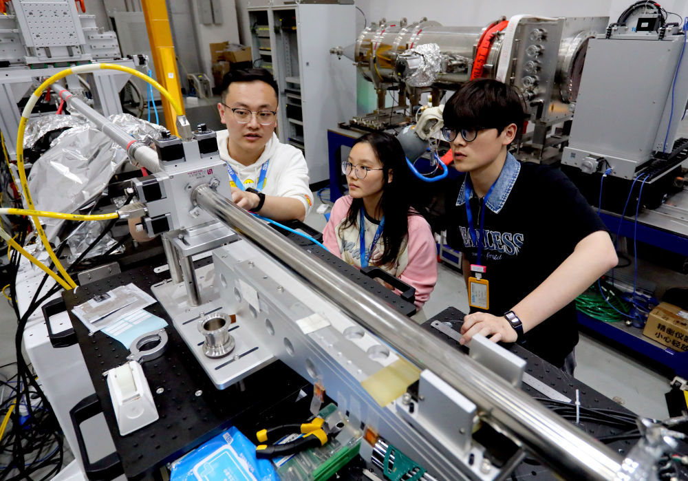 2024年4月10日,安徽省先進功能高分子薄膜工程實驗室團隊成員朱健和(左)在上海同步輻射光源實驗線站向團隊成員講解實驗設備運行情況。
