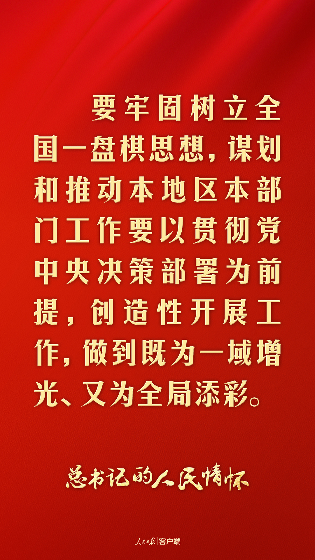 “要牢固樹立全國一盤棋思想,謀劃和推動本地區(qū)本部門工作要以貫徹黨中央決策部署為前提,創(chuàng)造性開展工作,做到既為一域增光、又為全局添彩?!?/p>