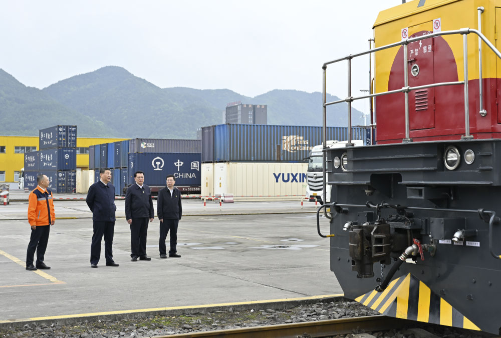 4月22日,習(xí)近平總書(shū)記在重慶國(guó)際物流樞紐園區(qū)考察。新華社記者 王曄 攝