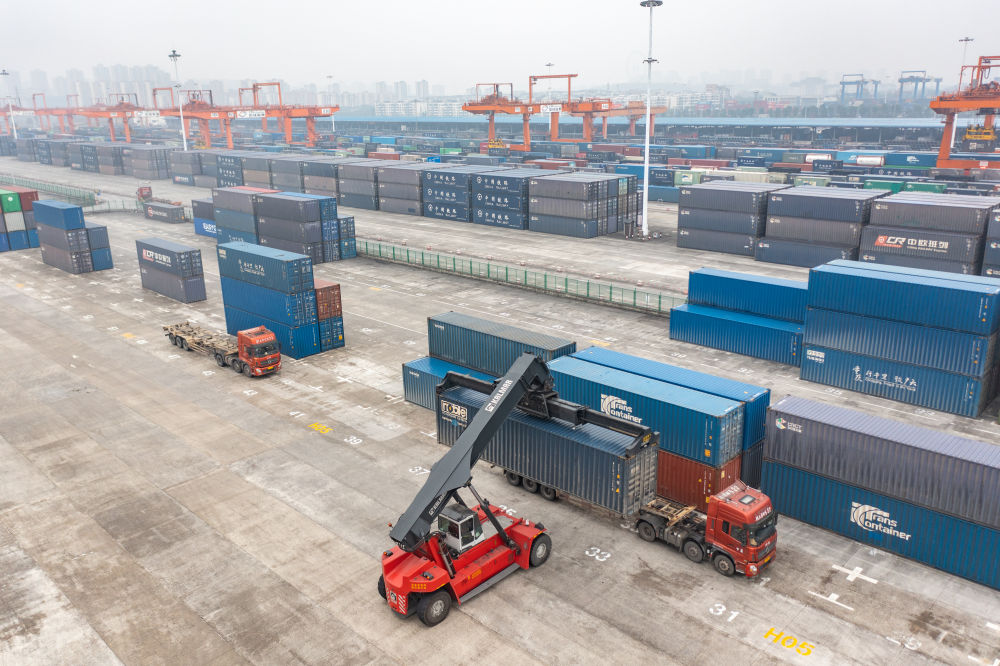 3月7日,在重慶團(tuán)結(jié)村中心站的海關(guān)監(jiān)管區(qū),工作人員將通過(guò)中歐班列發(fā)運(yùn)的貨物清關(guān)后裝上貨車(chē)運(yùn)往編組站進(jìn)行編組(無(wú)人機(jī)照片)。新華社記者 黃偉 攝