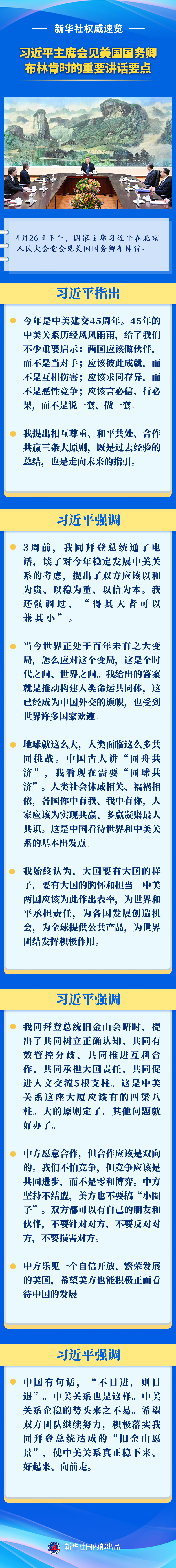 4月26日下午,國家主席習(xí)近平在北京人民大會(huì)堂會(huì)見美國國務(wù)卿布林肯。來看習(xí)近平主席的重要講話要點(diǎn)。
