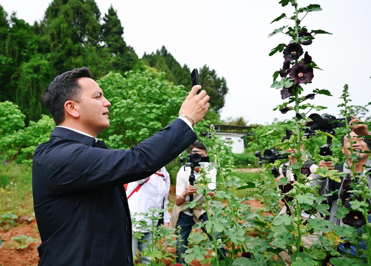 2024年4月23日,國(guó)際園藝生產(chǎn)者協(xié)會(huì)主席萊昂納多·卡皮塔尼奧在成都市金堂縣鮮花山谷景區(qū)考察蜀葵產(chǎn)業(yè)。