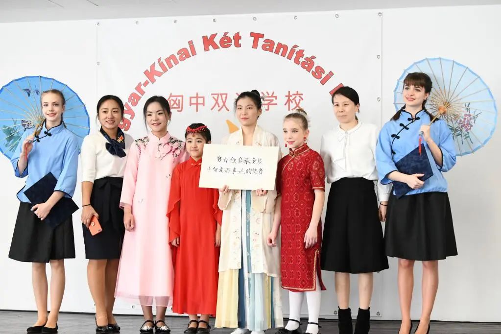 在匈牙利布達佩斯的匈中雙語學(xué)校,師生們在復(fù)信轉(zhuǎn)交儀式后手持“努力做傳承發(fā)展中匈友好事業(yè)的使者”的標(biāo)語合影。(圖源:新華社)