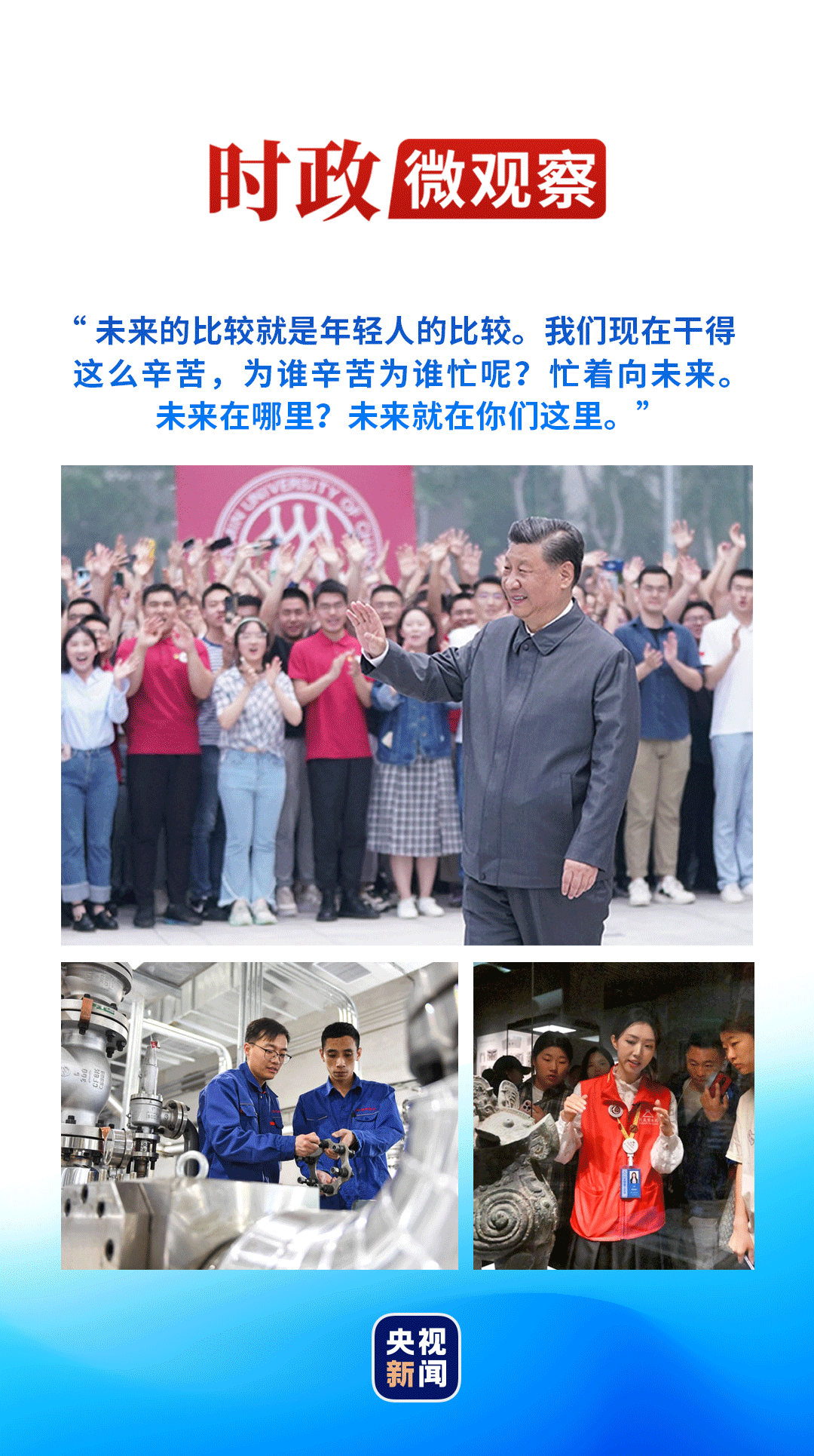 “青年是祖國(guó)的前途、民族的希望、創(chuàng)新的未來(lái)?!薄拔业饺魏我粋€(gè)地方都關(guān)心青年?!绷?xí)近平總書(shū)記始終心系青年、關(guān)懷青年、傾聽(tīng)青年,衷心希望每一個(gè)青年都成為社會(huì)主義建設(shè)者和接班人。