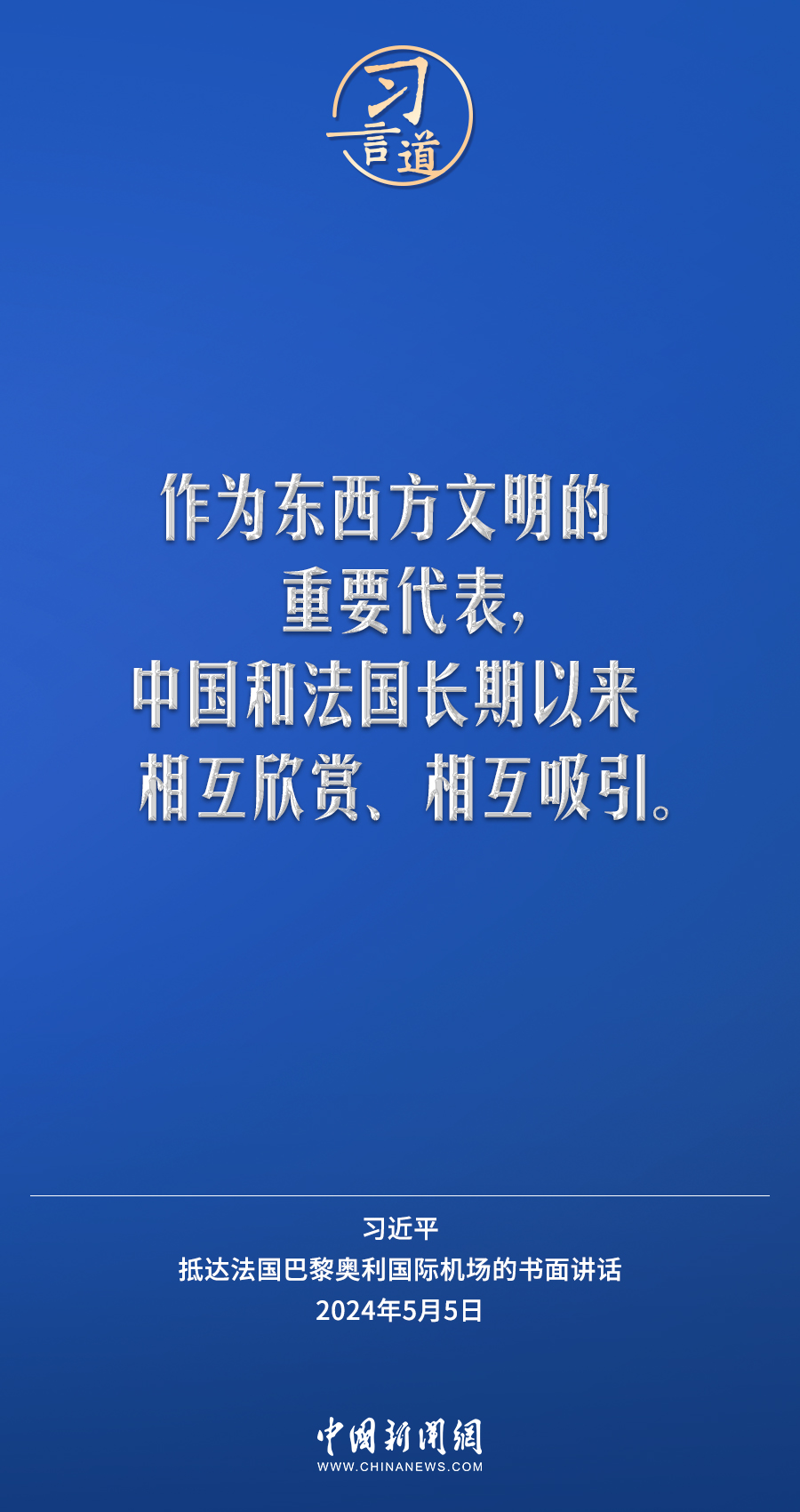 當?shù)貢r間5月5日下午,國家主席習近平抵達巴黎,開始對法國進行國事訪問。在抵達法國巴黎奧利國際機場的書面講話中,習近平指出——