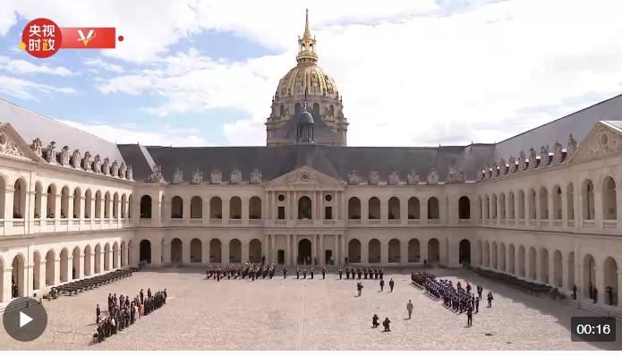 當(dāng)?shù)貢r間5月6日下午,在馬克龍陪同下,習(xí)近平檢閱法蘭西共和國衛(wèi)隊和陸??杖妰x仗隊。
