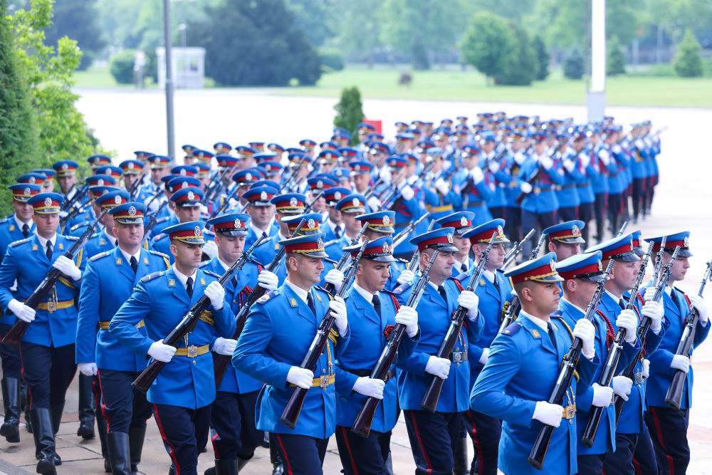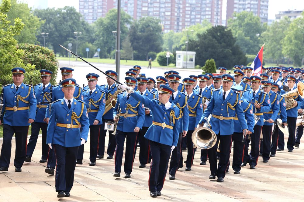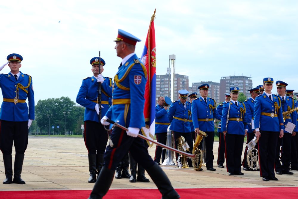 塞爾維亞大廈前,中塞兩國國旗迎風(fēng)飄揚(yáng),儀仗隊(duì)威武雄壯。