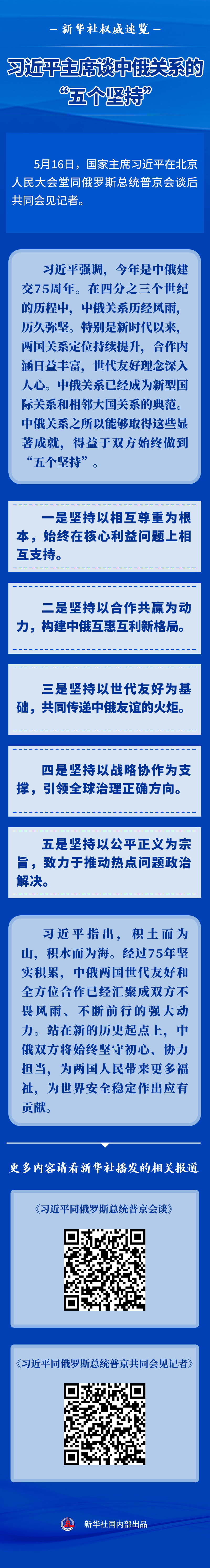5月16日,國(guó)家主席習(xí)近平在北京人民大會(huì)堂同俄羅斯總統(tǒng)普京會(huì)談后共同會(huì)見(jiàn)記者。習(xí)主席談到中俄關(guān)系的“五個(gè)堅(jiān)持”。