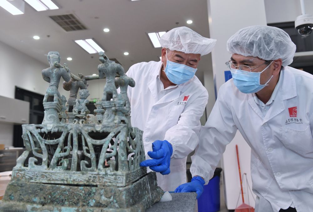 2023年5月30日,在四川三星堆博物館文物保護(hù)和修復(fù)中心,三星堆博物館陳列保管部副部長(zhǎng)郭漢中(左)與同事討論神壇底座修復(fù)方案。