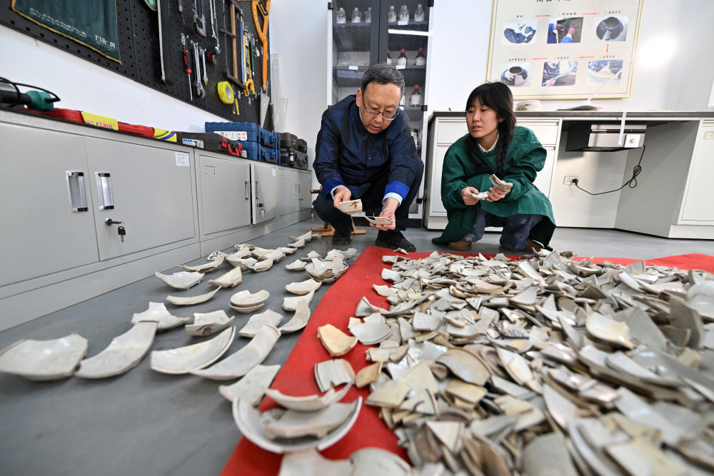 2024年2月23日,在中國社會(huì)科學(xué)院考古研究所安陽工作站,工作人員在整理修復(fù)殷墟洹北商城出土的陶片。