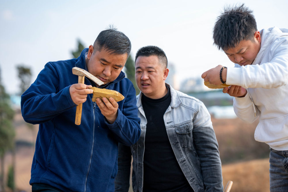 2024年2月22日,云南澄江化石地世界自然遺產(chǎn)博物館副館長(zhǎng)郭進(jìn)(左一)和同事在云南省澄江市黑蟆地查看采集到的化石標(biāo)本。