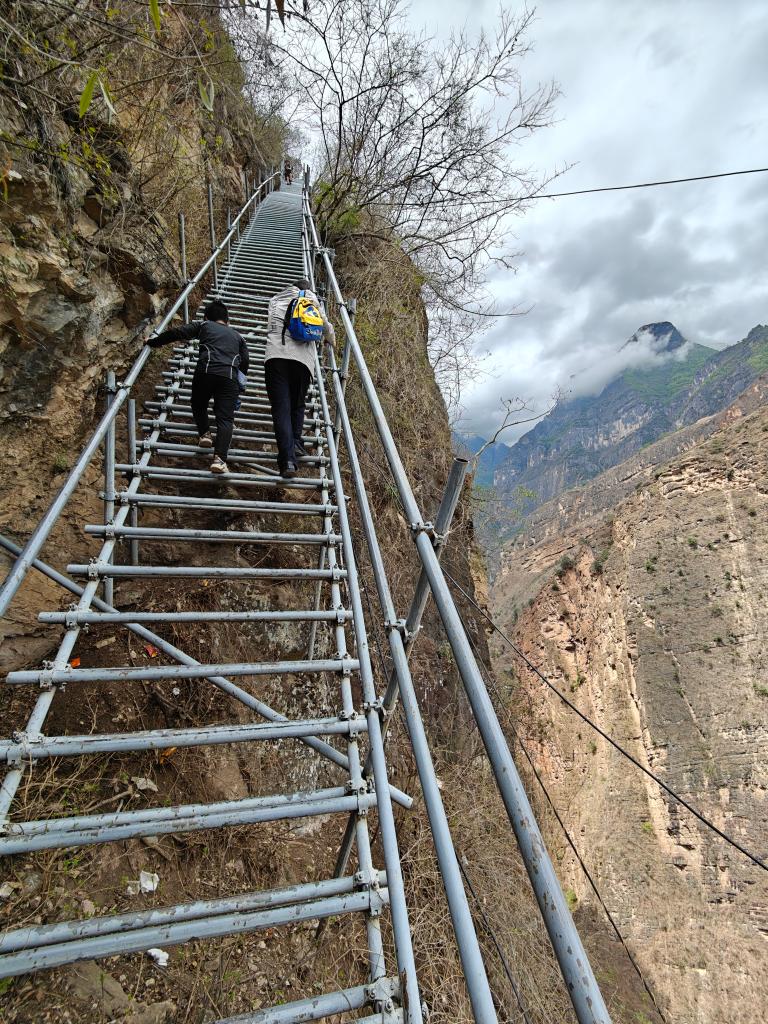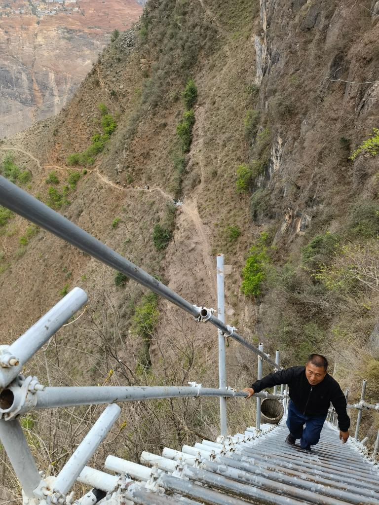 懸崖村因脫貧攻堅而廣受關(guān)注,外地許多人自發(fā)到這里攀登鋼梯。鋼梯剛開始倒還平緩,翻上幾個拐彎后,就陡峭起來,而且越來越險。鋼梯之上,一個個身影縮為小點,身子懸空,只敢手腳并用,緊緊拽住鋼梯,向上攀去。