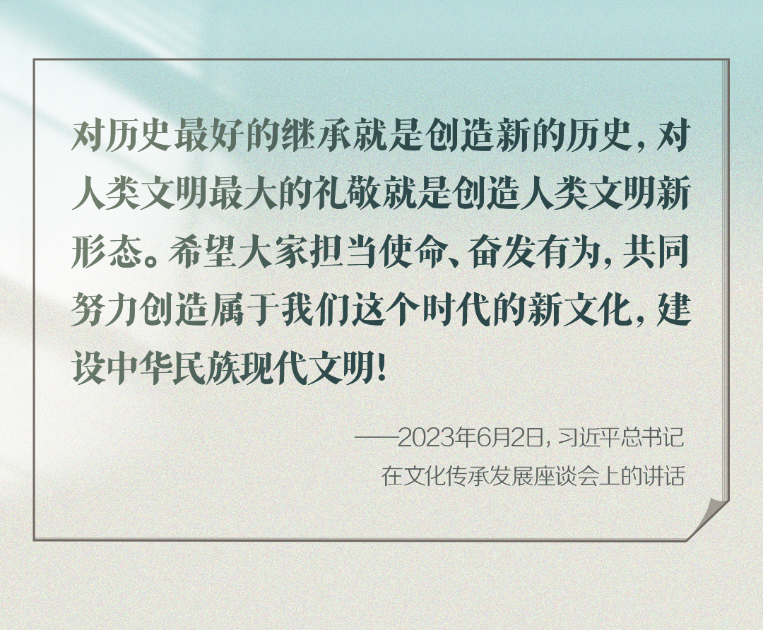 2023年6月2日,習(xí)近平總書記在文化傳承發(fā)展座談會上強(qiáng)調(diào):“在新的起點上繼續(xù)推動文化繁榮、建設(shè)文化強(qiáng)國、建設(shè)中華民族現(xiàn)代文明,是我們在新時代新的文化使命?!?/p>