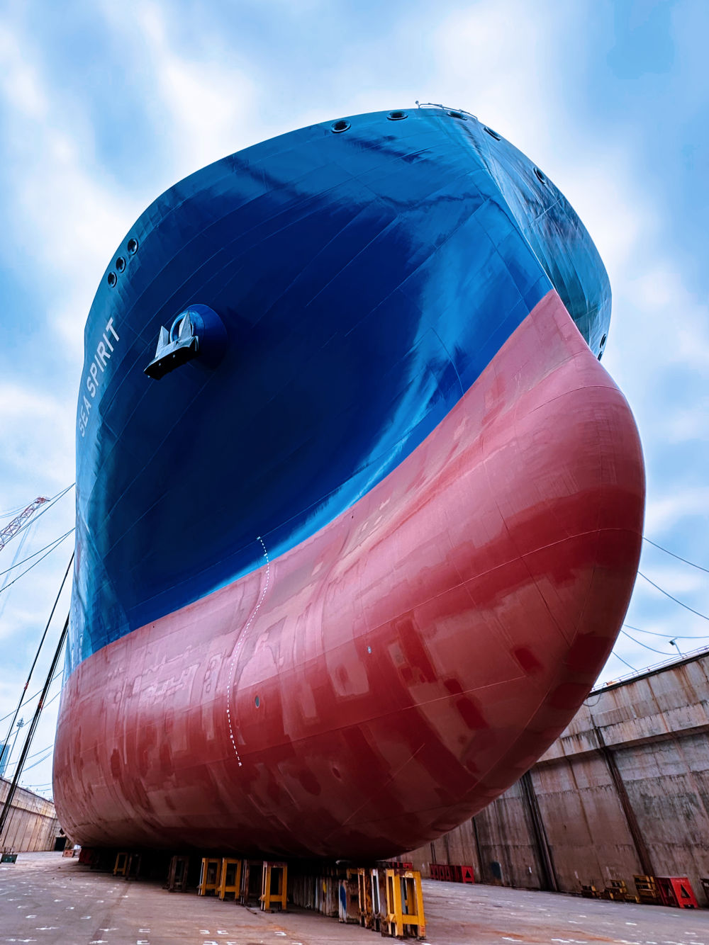 ?。对碌拇筮B,碧海流云。中國船舶集團(tuán)大連船舶重工集團(tuán)有限公司(簡稱“中國船舶大連造船”)一艘正在建造的17.5萬立方米LNG運(yùn)輸船??吭诖a頭,400多名工人上上下下,正在進(jìn)行貨物圍護(hù)系統(tǒng)的施工。