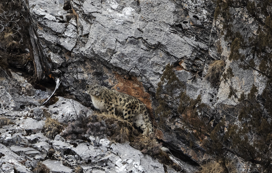 2023年2月21日,在青海省玉樹藏族自治州雜多縣昂賽鄉(xiāng)境內(nèi)的昂賽大峽谷內(nèi),一只雪豹準(zhǔn)備向上攀爬。新華社記者 費(fèi)茂華 攝
