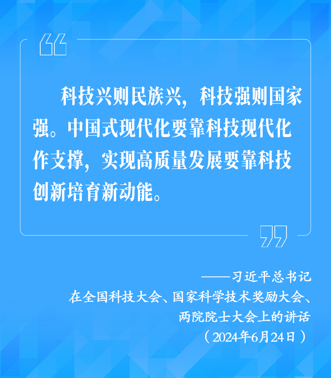 6月24日,全國科技大會(huì)、國家科學(xué)技術(shù)獎(jiǎng)勵(lì)大會(huì)、兩院院士大會(huì)在北京召開,習(xí)近平總書記為國家最高科學(xué)技術(shù)獎(jiǎng)獲得者等頒獎(jiǎng)并發(fā)表重要講話??倳洀?qiáng)調(diào),科技興則民族興,科技強(qiáng)則國家強(qiáng)。中國式現(xiàn)代化要靠科技現(xiàn)代化作支撐,實(shí)現(xiàn)高質(zhì)量發(fā)展要靠科技創(chuàng)新培育新動(dòng)能。