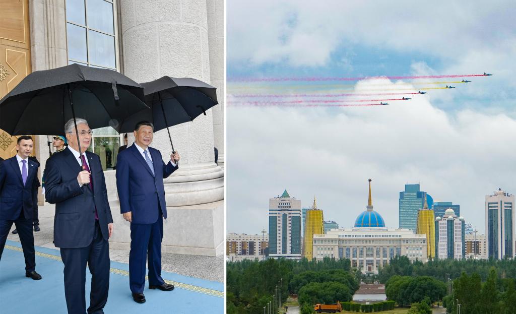 當(dāng)?shù)貢r(shí)間7月3日,國(guó)家主席習(xí)近平在阿斯塔納出席哈薩克斯坦總統(tǒng)托卡耶夫舉行的歡迎儀式。習(xí)近平乘車抵達(dá)總統(tǒng)府時(shí),托卡耶夫總統(tǒng)熱情迎接。六架哈薩克斯坦空軍戰(zhàn)機(jī)從總統(tǒng)府上空飛過(guò),拉出象征中國(guó)國(guó)旗的紅黃色彩煙,以最高禮儀歡迎習(xí)近平對(duì)哈薩克斯坦進(jìn)行國(guó)事訪問(wèn)。