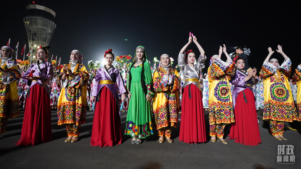 1500多名身著民族盛裝的塔吉克斯坦青年,表演富有濃郁特色的中塔歌舞,揮舞中塔兩國(guó)國(guó)旗,表達(dá)對(duì)中國(guó)領(lǐng)導(dǎo)人的熱烈歡迎。