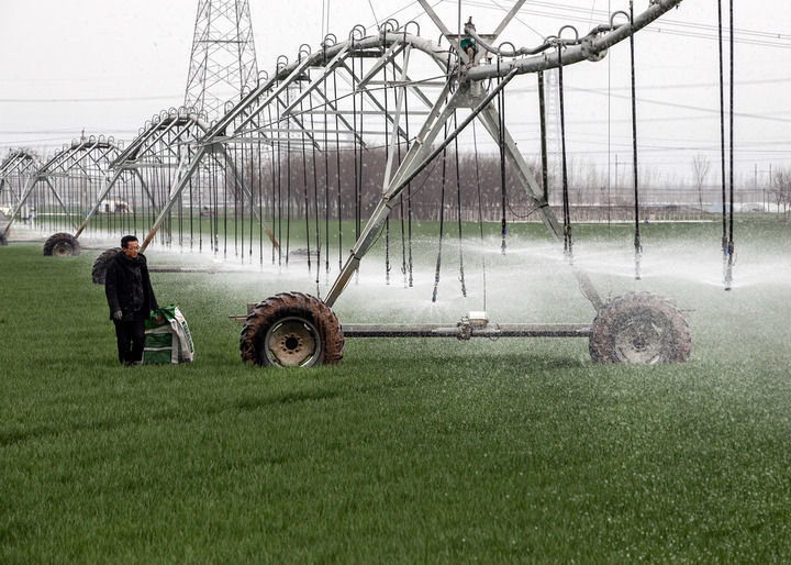 2024年3月18日,在河南省焦作市博愛縣孝敬鎮(zhèn)東原莊村瑞輝家庭農(nóng)場,村民使用全自動指針式噴灌機(jī)進(jìn)行澆灌作業(yè)。