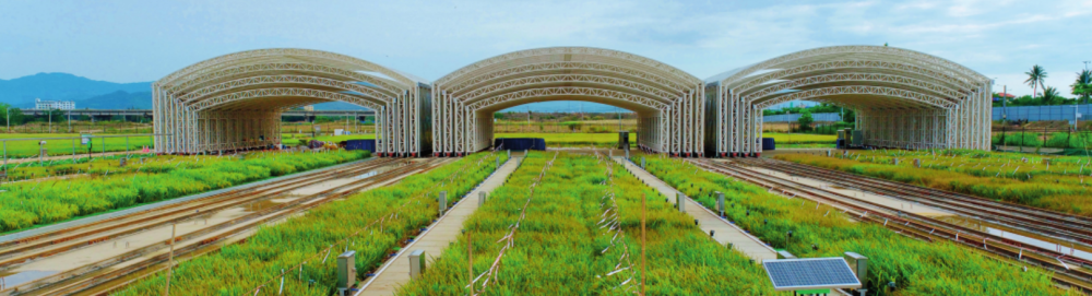 在位于三亞的國家耐鹽堿水稻技術(shù)創(chuàng)新中心崖州灣總部科研試驗基地,建設(shè)了高標準試驗田、鹽(堿)性精準鑒定鹽池、自動防雨鋼棚、水土鹽堿度智能化監(jiān)測系統(tǒng)等配套設(shè)施(2024年5月17日攝)。黎多江攝/本刊