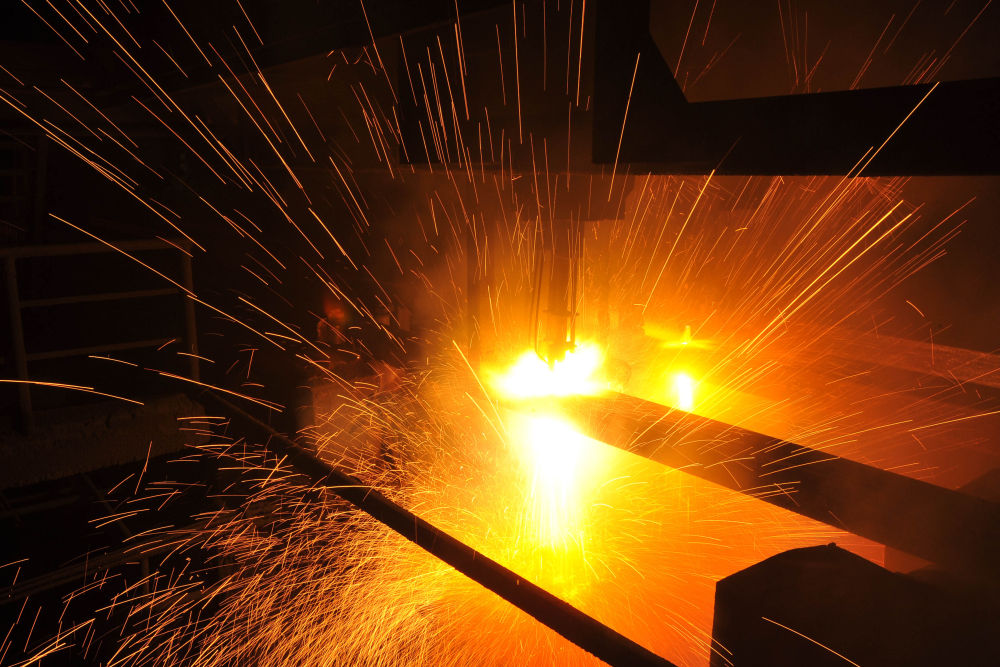 2015年3月10日,東北特鋼集團大連基地生產(chǎn)的合金鋼連鑄坯進行定尺切割。新華社發(fā)