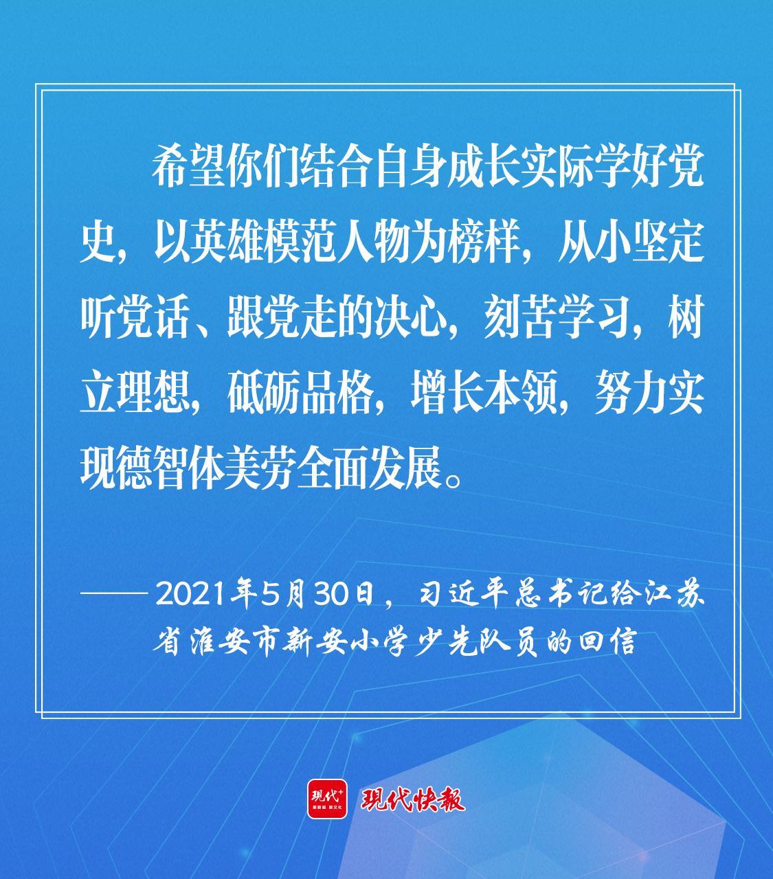 2021年5月30日,習近平總書記給江蘇省淮安市新安小學少先隊員回信時強調(diào),“希望你們結(jié)合自身成長實際學好黨史,以英雄模范人物為榜樣,從小堅定聽黨話、跟黨走的決心,刻苦學習,樹立理想,砥礪品格,增長本領(lǐng),努力實現(xiàn)德智體美勞全面發(fā)展?!?/p>