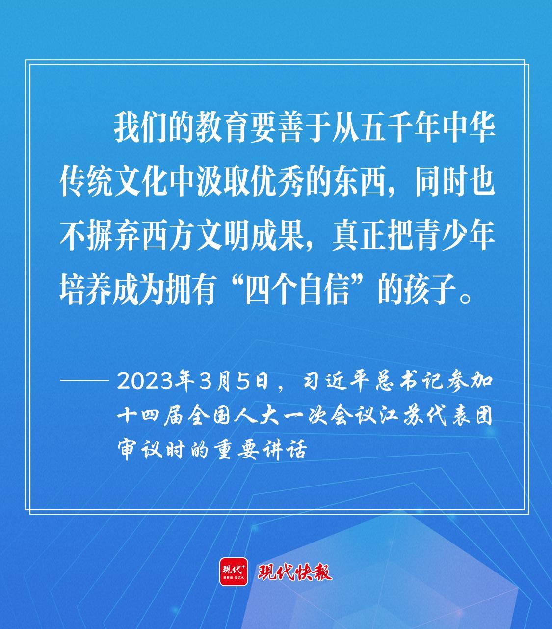 2023年3月5日,習近平總書記參加十四屆全國人大一次會議江蘇代表團審議時,勉勵教育工作者“要善于從五千年中華傳統(tǒng)文化中汲取優(yōu)秀的東西,同時也不摒棄西方文明成果,真正把青少年培養(yǎng)成為擁有‘四個自信’的孩子?!?/p>